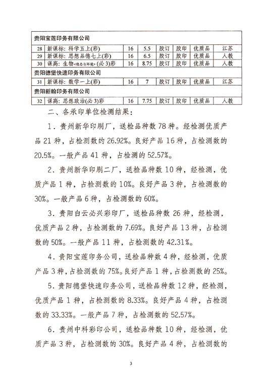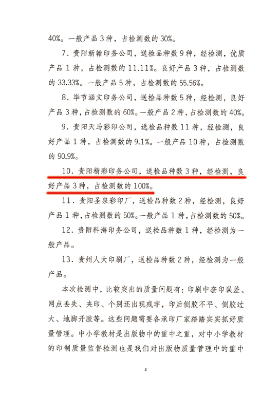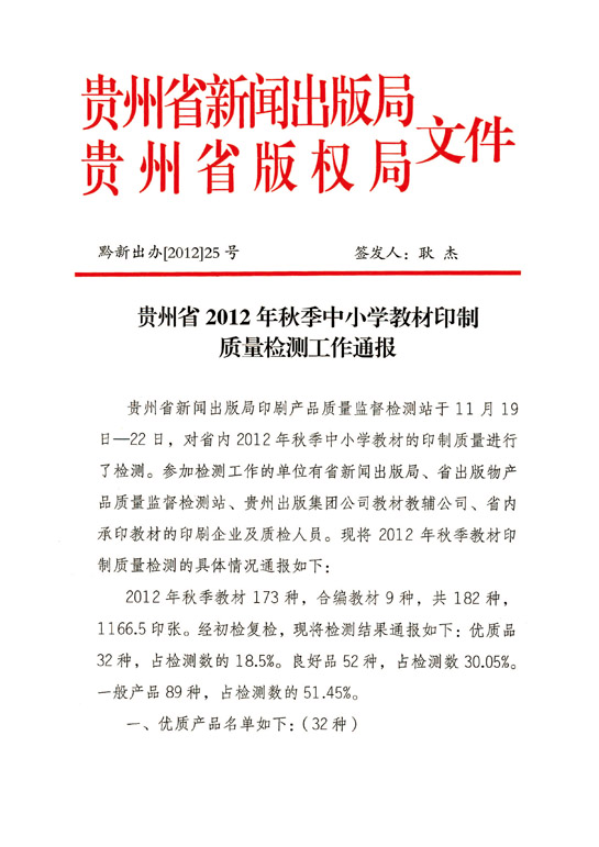 2012年12月,贵州省新闻版局下发“贵州2012年秋季中小学教材印制质量检测工作通报”文件,我公司首次参评,就获得表彰。