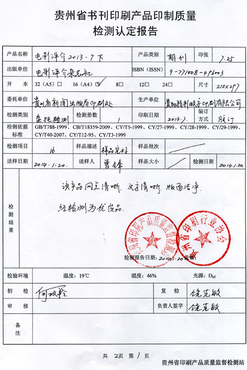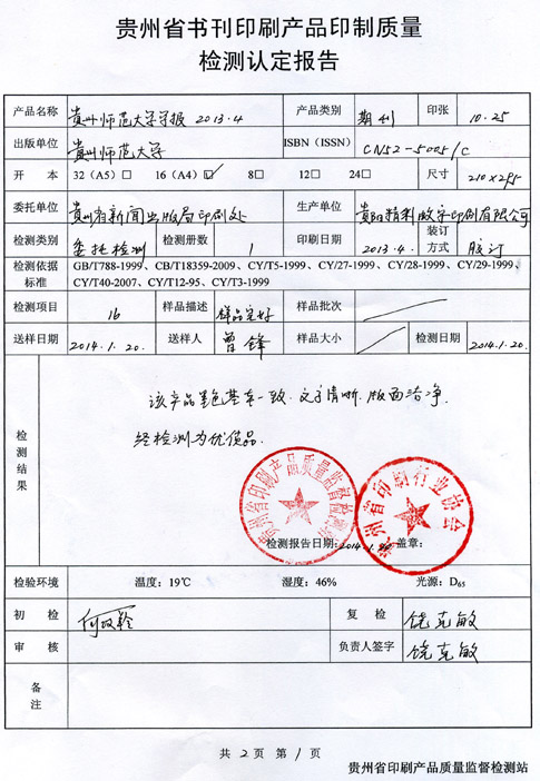 2014年1月20号,经贵州省印刷产品质量监督检测站检测,我公司送检的三本样书都获得优质产品。以下为检查报告书,共计三份。