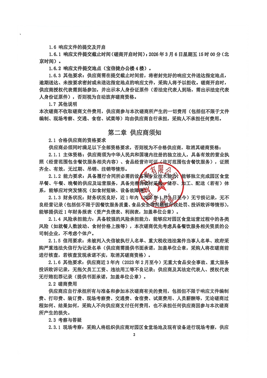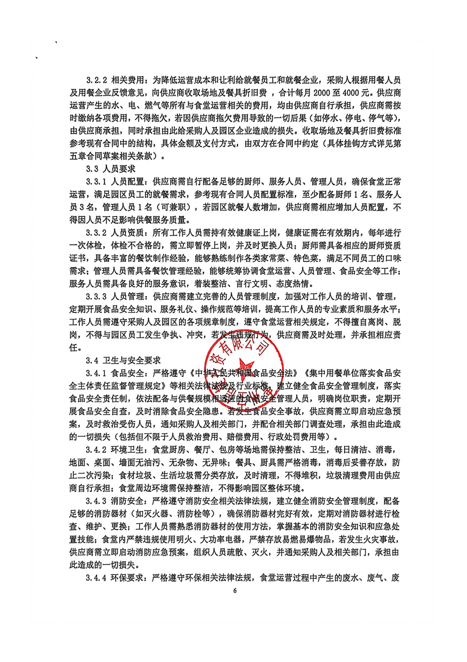 服务内容:为园区企业员工提供早餐、午餐、晚餐服务。具体要求包括但不限于:围绕15元/餐核心餐标设计多样化菜品、保障食品安全与营养、维护环境卫生、提供多元化经营模式(如特色窗口)等。详情见磋商文件。
