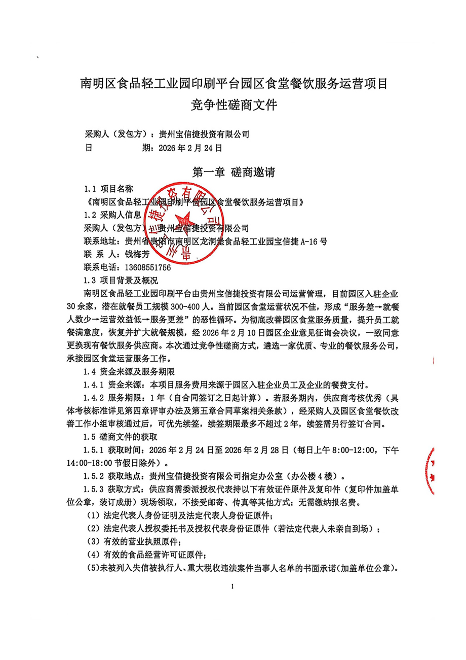 贵州宝信捷投资有限公司(以下简称“采购人”)现对“南明区食品轻工业园印刷平台园区食堂餐饮服务运营项目”采用竞争性磋商方式遴选服务供应商,欢迎符合资格条件的供应商前来参与。
